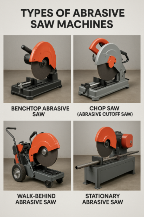 Ferăstraiele abrazive vin în diferite configurații, fiecare potrivită pentru diferite aplicații. Cele mai comune tipuri includ: